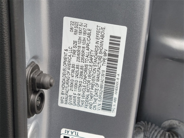 - VIN : 5J6RW2H89NA013918